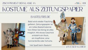 Im Rahmen des ZISCH-Projekts hat die Klasse 4a mit viel Begeisterung und Fantasie Kostüme aus Zeitungspapier gestaltet. Passend zur bevorstehenden Faschingszeit verwandelten die Schülerinnen und Schüler einfache Zeitungen in originelle Verkleidungen: Ritter, König oder... - Zeitung erleben – Klasse 4a nimmt am ZISCH-Projekt teil