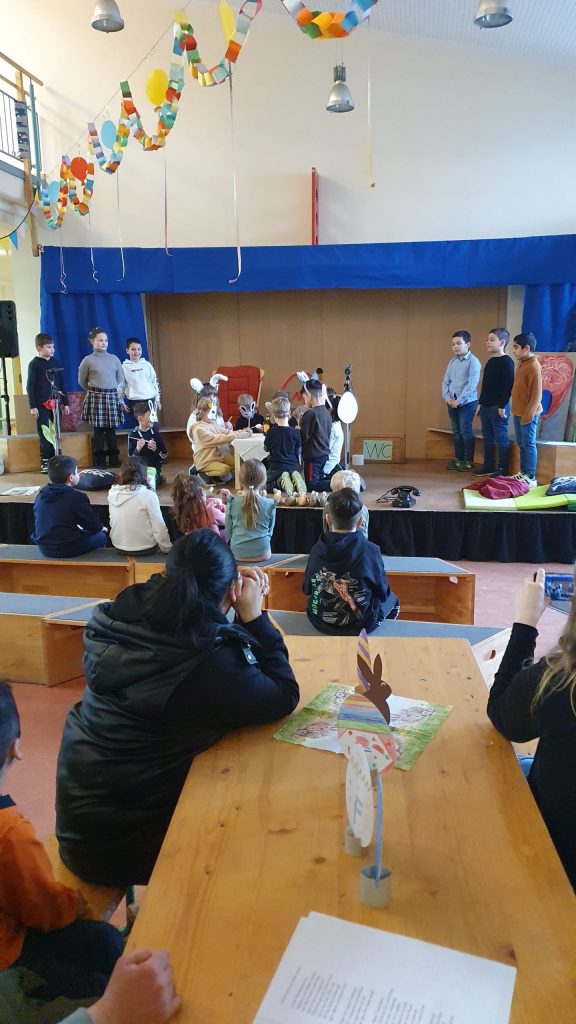 Stolz führten die Zweitklässler das Theaterstück „10 kleine Osterhasen“ auf.