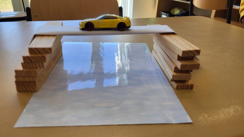 Aus Papier wurde ein Träger für eine Balkenbrücke über einen Fluss gebaut, welche ein Spielzeugauto tragen musste: