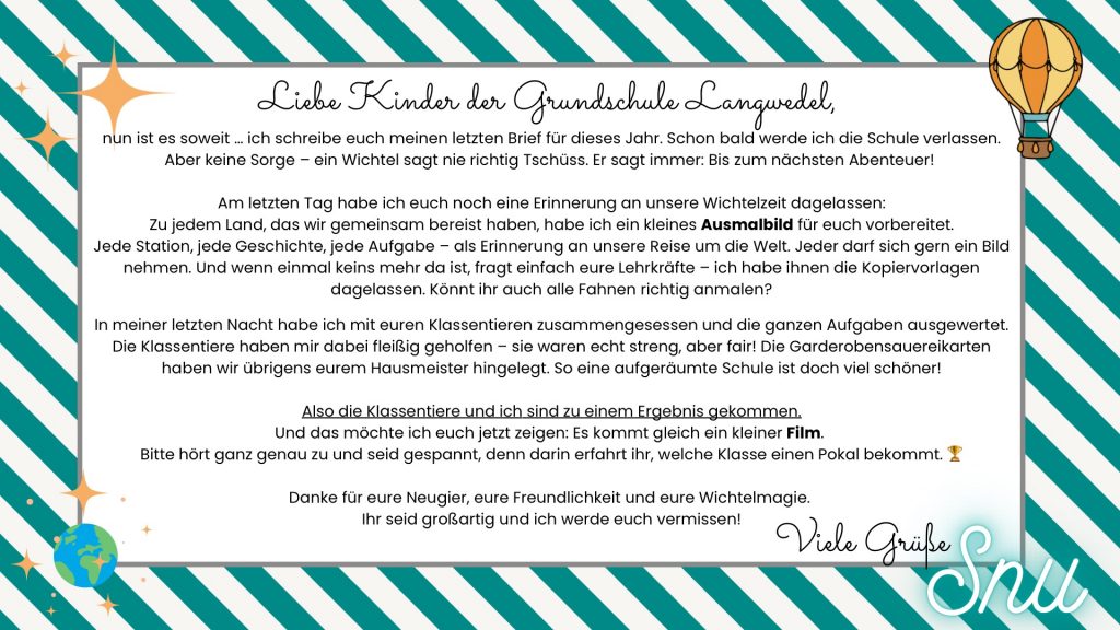 Es war eine sehr schöne Zeit mit unserem Schulwichtel.
