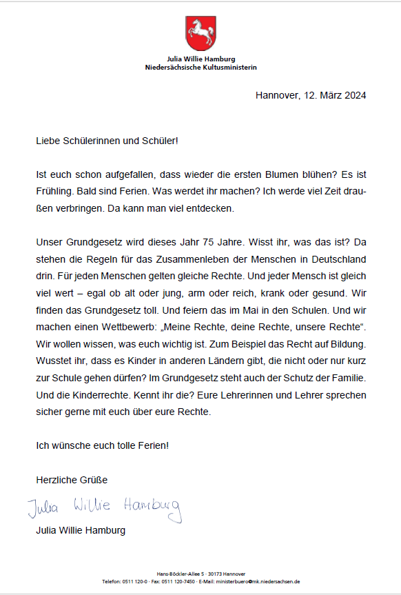 Liebe Schulgemeinschaft, heute war der letzte Schultag, und damit starten die Kinder in die wohlverdienten Osterferien. Das zweite Schulhalbjahr begann sehr turbulent, und leider gab es bis zu den Osterferien zwei Stundenplanwechsel. Dafür möchten...