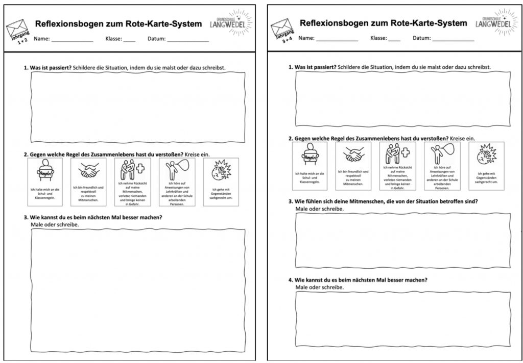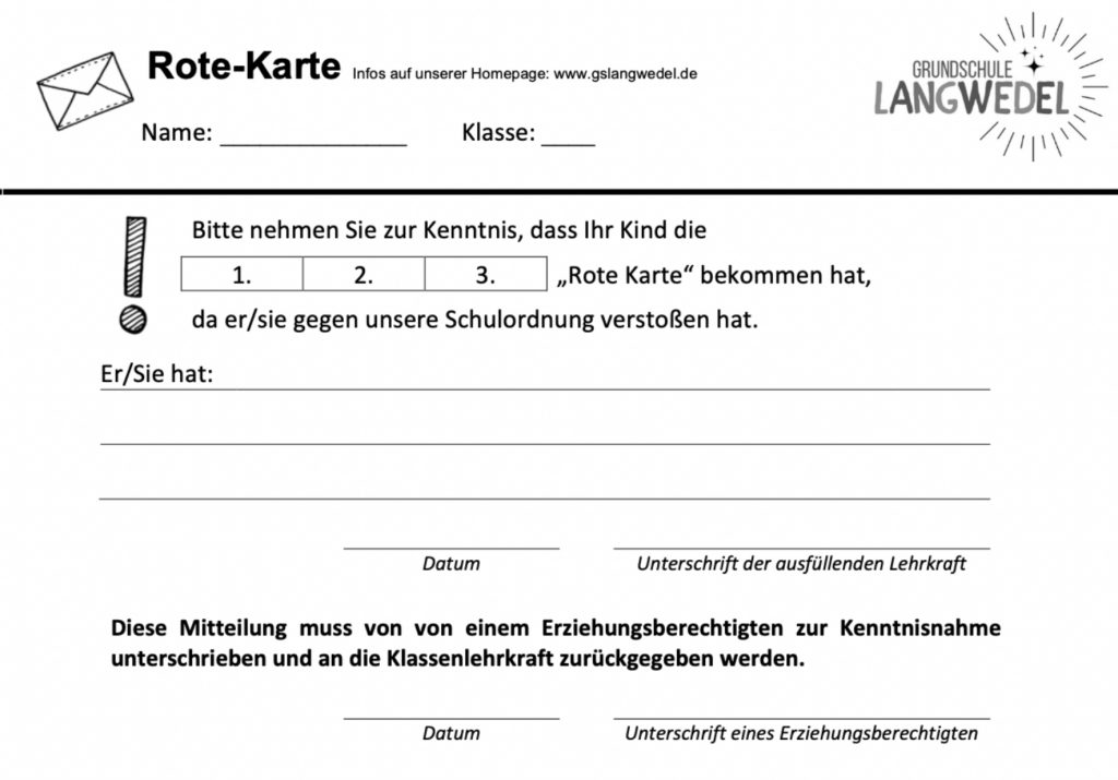 Minderung von Störungen im Unterricht dienen. Sollte ein Kind von einer Lehrkraft eine „rote Karte“ erhalten, wird diese zusammen mit einem Reflexionsbogen mit nach Hause gegeben. Diese ist von einem Erziehungsberechtigten zu unterzeichnen und am nächsten Tag bei der Klassenlehrkraft abzugeben. Zudem wird in einem persönlichen Gespräch der Sachverhalt nochmals mit dem Kind thematisiert und reflektiert.